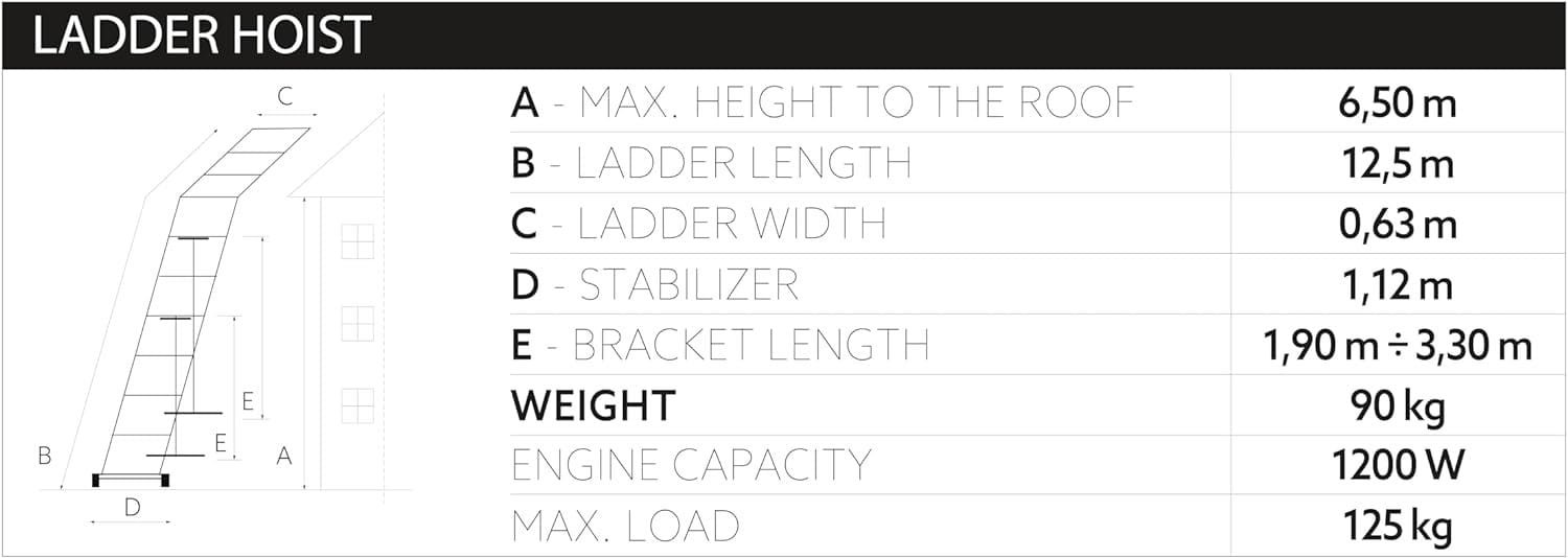 Saulės elektrinių montavimo liftas DRABEST yra lengva aliuminio konstrukcija, kuri puikiai tiks kaip kasdieninė atrama atliekant statybos ir atnaujinimo darbus. Lengva surinkti ir išardyti, o po sulankstymo kompaktiška forma leis patogiai transportuoti. Visų kopėčių elementų bendras svoris yra 90 kilogramų. Gervė žymiai pagreitina darbą ir taupo jo atlikimui reikalingą laiką, bei jėgas.